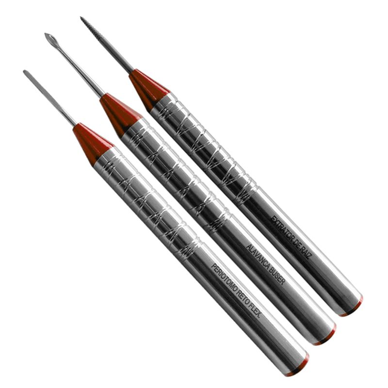 Contém: Alavanca Buser, Periótomo Flexível Reto e Extrator de Raiz. Alavanca Buser: Instrumento Delicado para a remoção de pontas de raiz em áreas de difícil acesso.