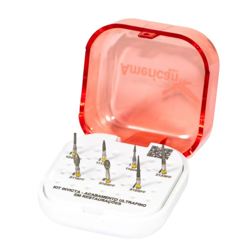 O Kit Invicta Acabamento Ultra Fino em Restaurações da American Burrs é projetado para proporcionar um acabamento refinado e preciso em restaurações dentárias. Este kit inclui ferramentas de acabamento ultra fino, ideais para detalhamento e polimento final de restaurações, garantindo uma superfície suave e esteticamente perfeita.